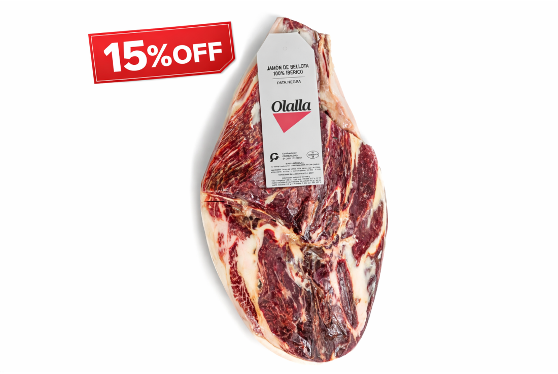 Dans ce jambon ibérique de bellota, élaboré selon les coutumes de la province de Huelva, vous pourrez découvrir le savoir-faire et l’élaboration artisanale d’Olalla. Ce jambon provient de porcs privilégiés qui sont élevés et nourris en plein air dans nos fantastiques pâturages naturels d’Andalousie. Nous obtenons ainsi des pièces de grande qualité. Attachés à notre histoire et à nos traditions familiales, pendant les saisons propices à l’abattage, nous élaborons un jambon de bellota de la plus haute qualité. Affiné dans nos séchoirs de Santa Olalla del Cala pendant 30 mois. Avec un arôme et une saveur uniques, ce jambon de bellota gourmet réjouira vos papilles gustatives. Vous devez vivre ces sensations de plaisir !